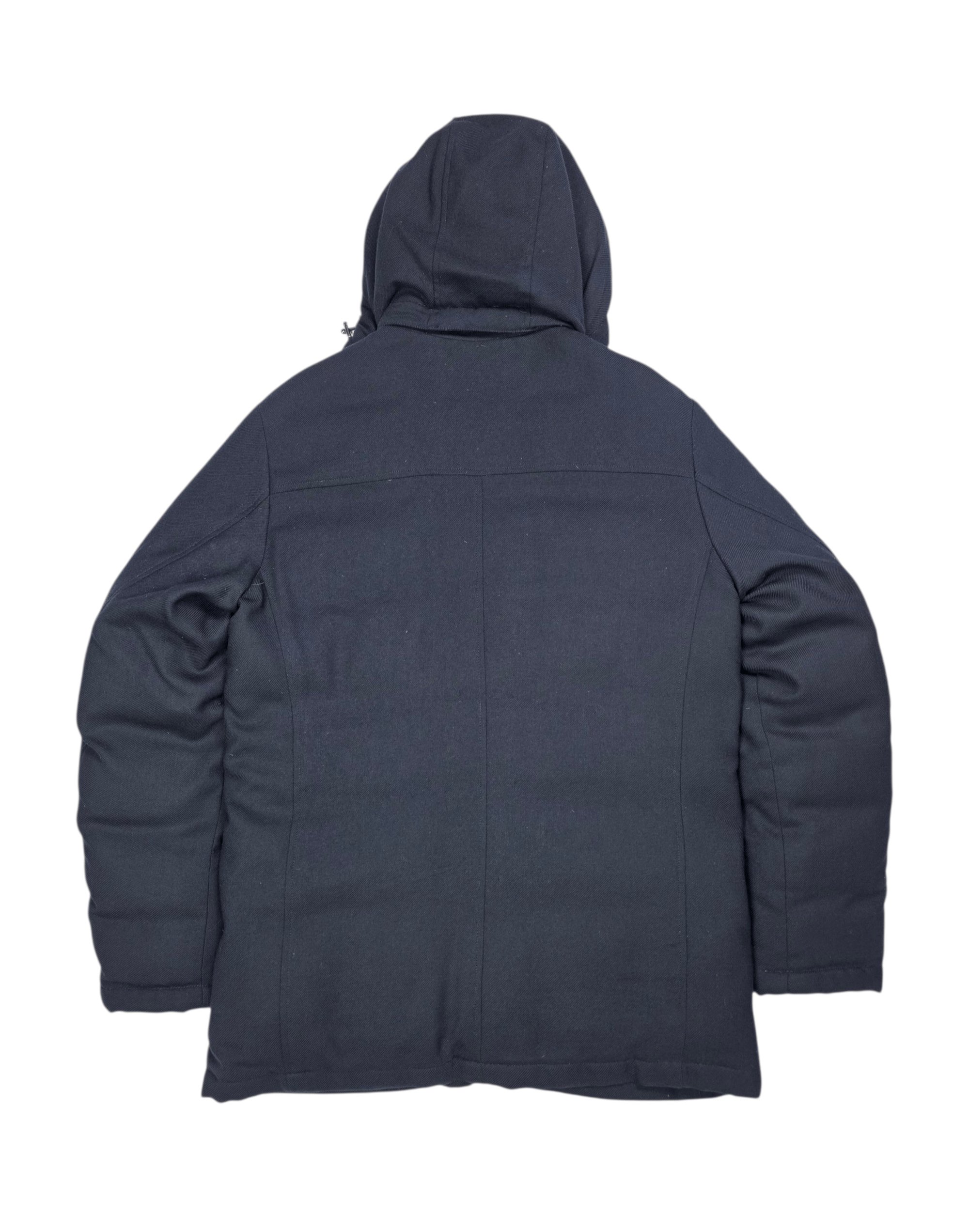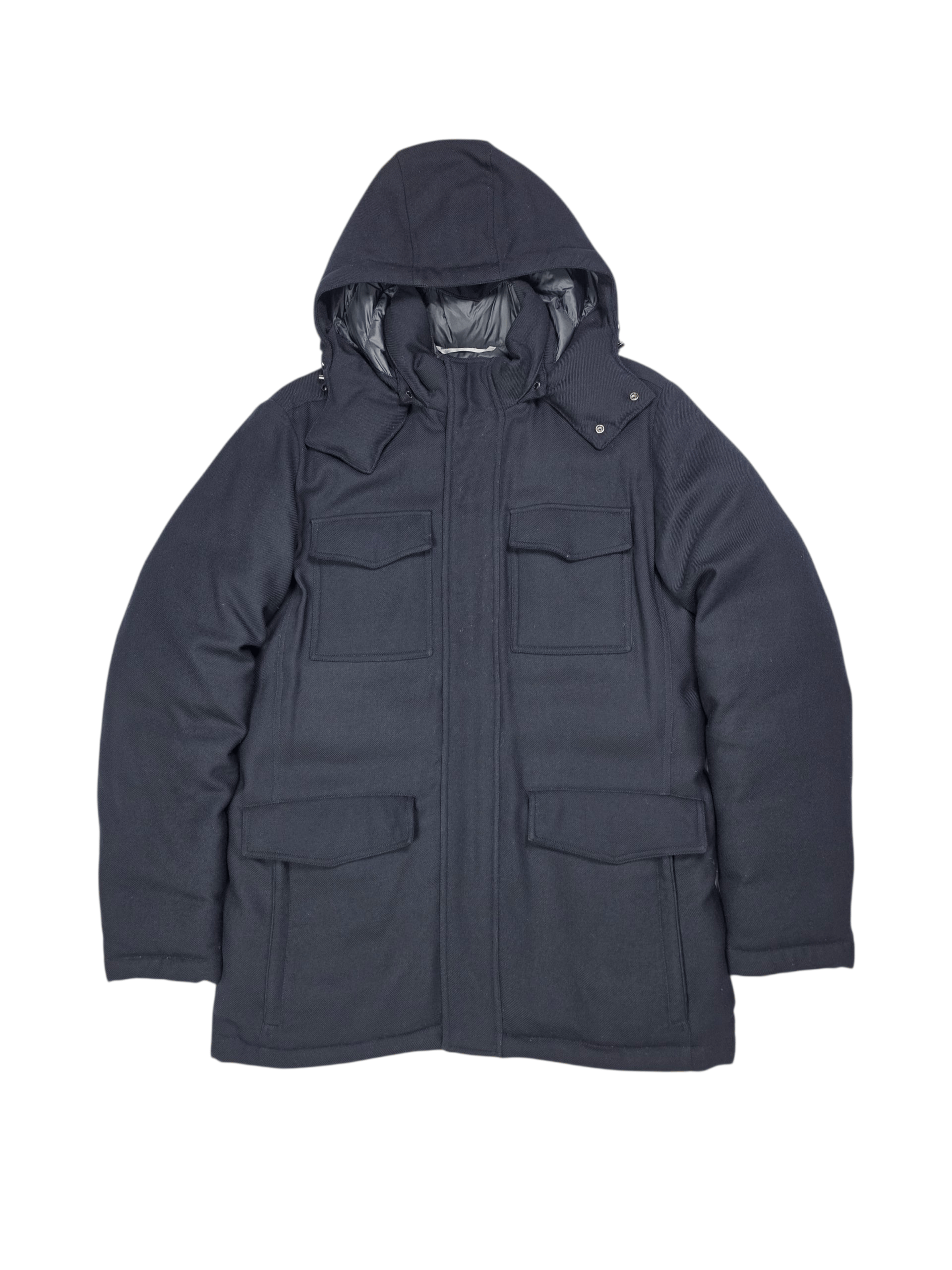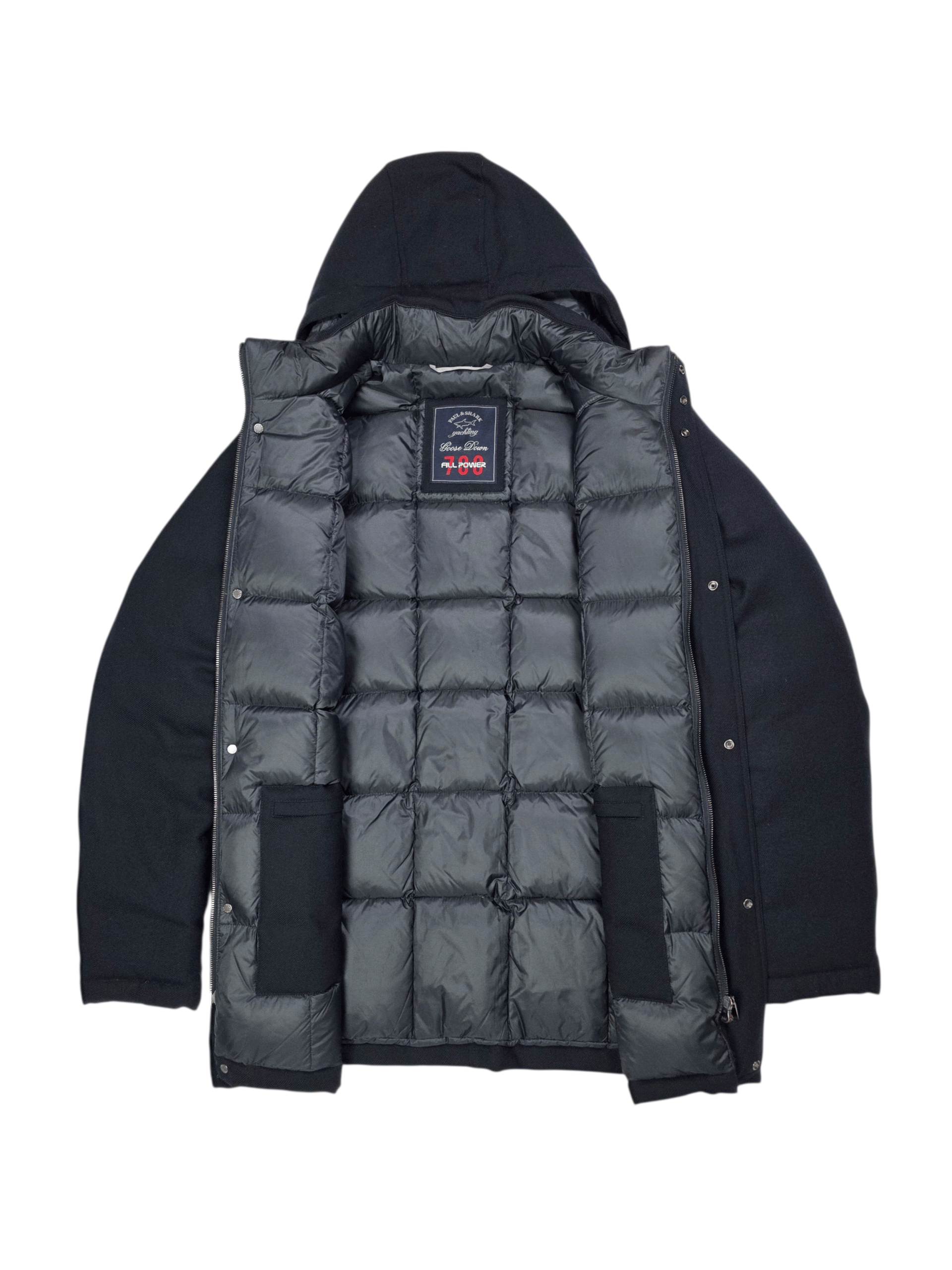 Paul & Shark Goose Down 700 Fill Power Wool jacket. Featuring six front pockets and a removable hood.