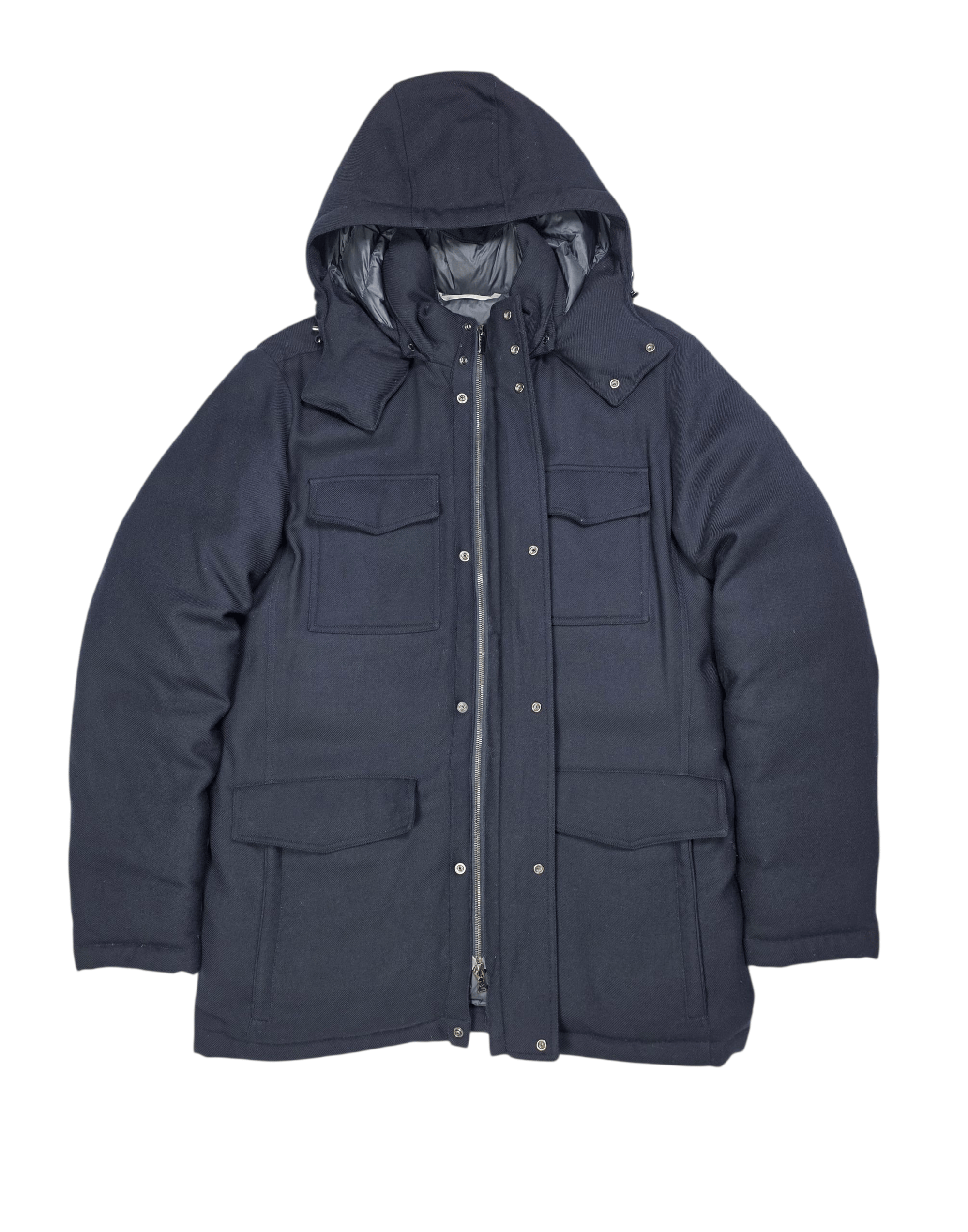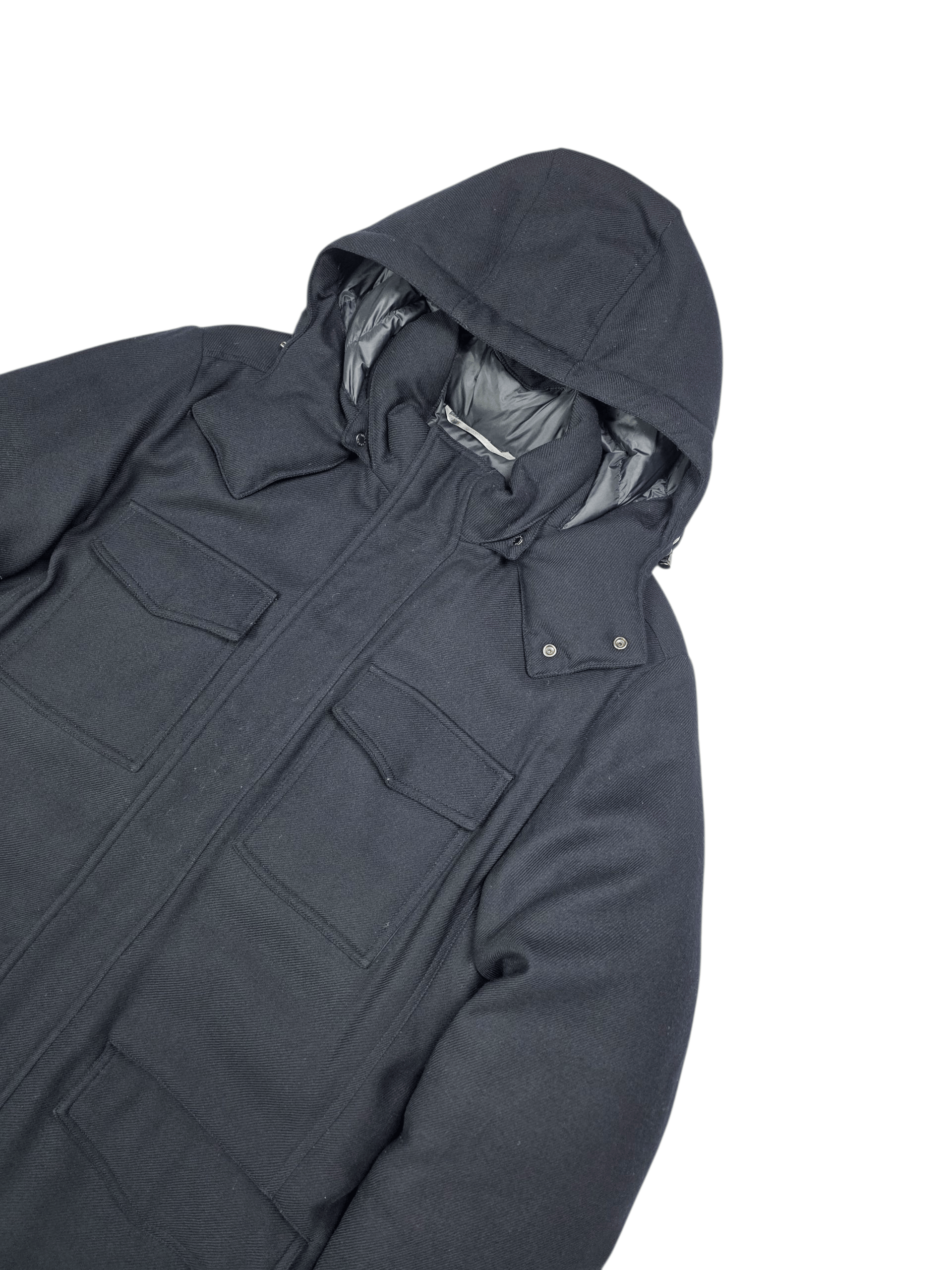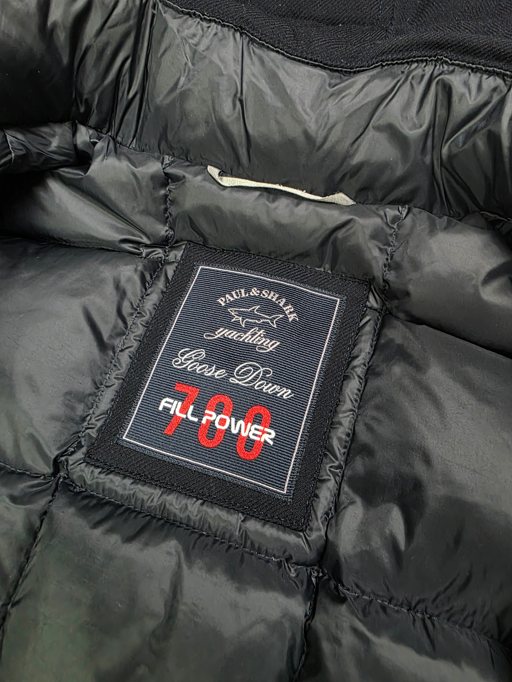 Paul & Shark Goose Down 700 Fill Power Wool jacket. Featuring six front pockets and a removable hood.