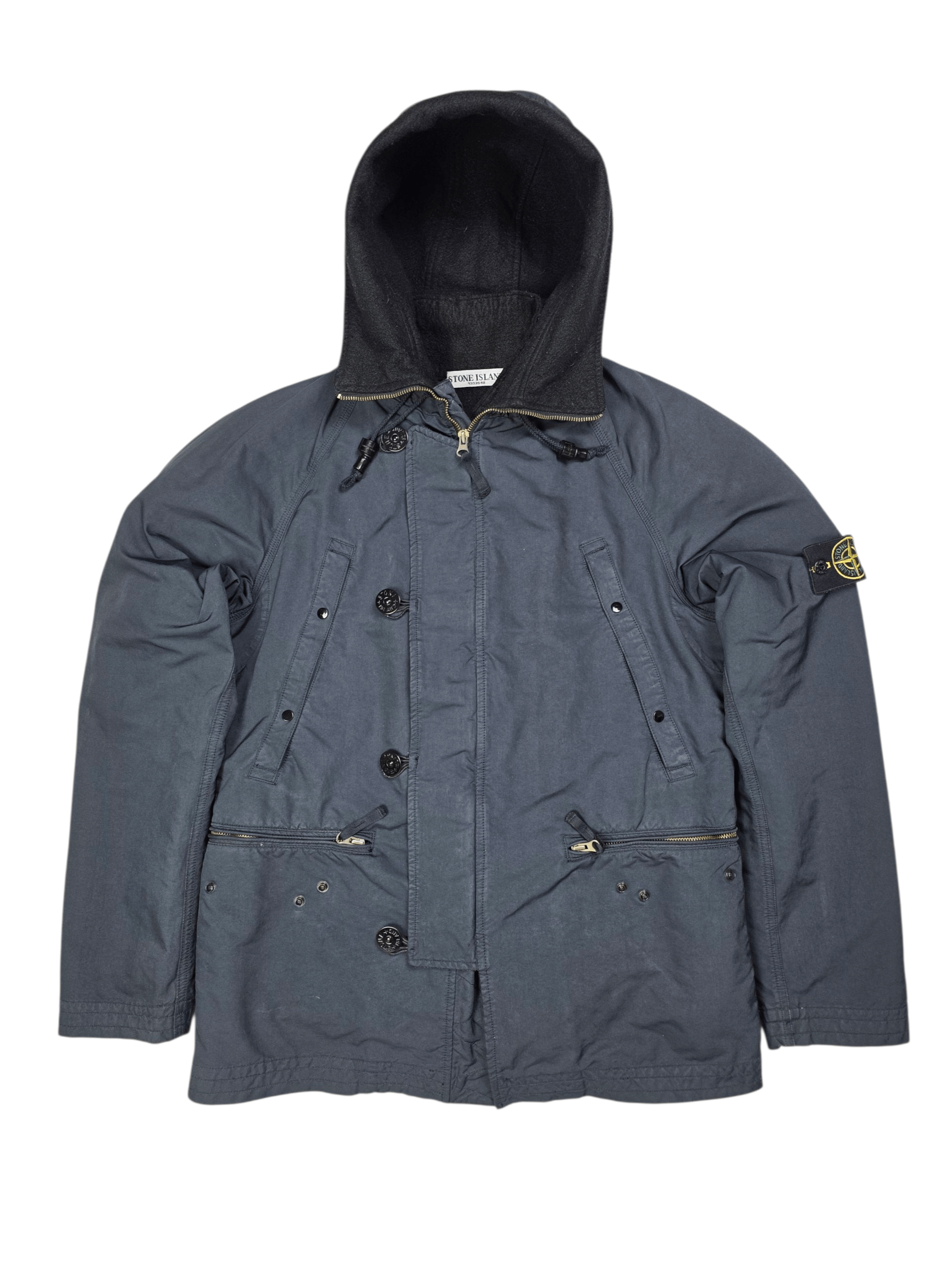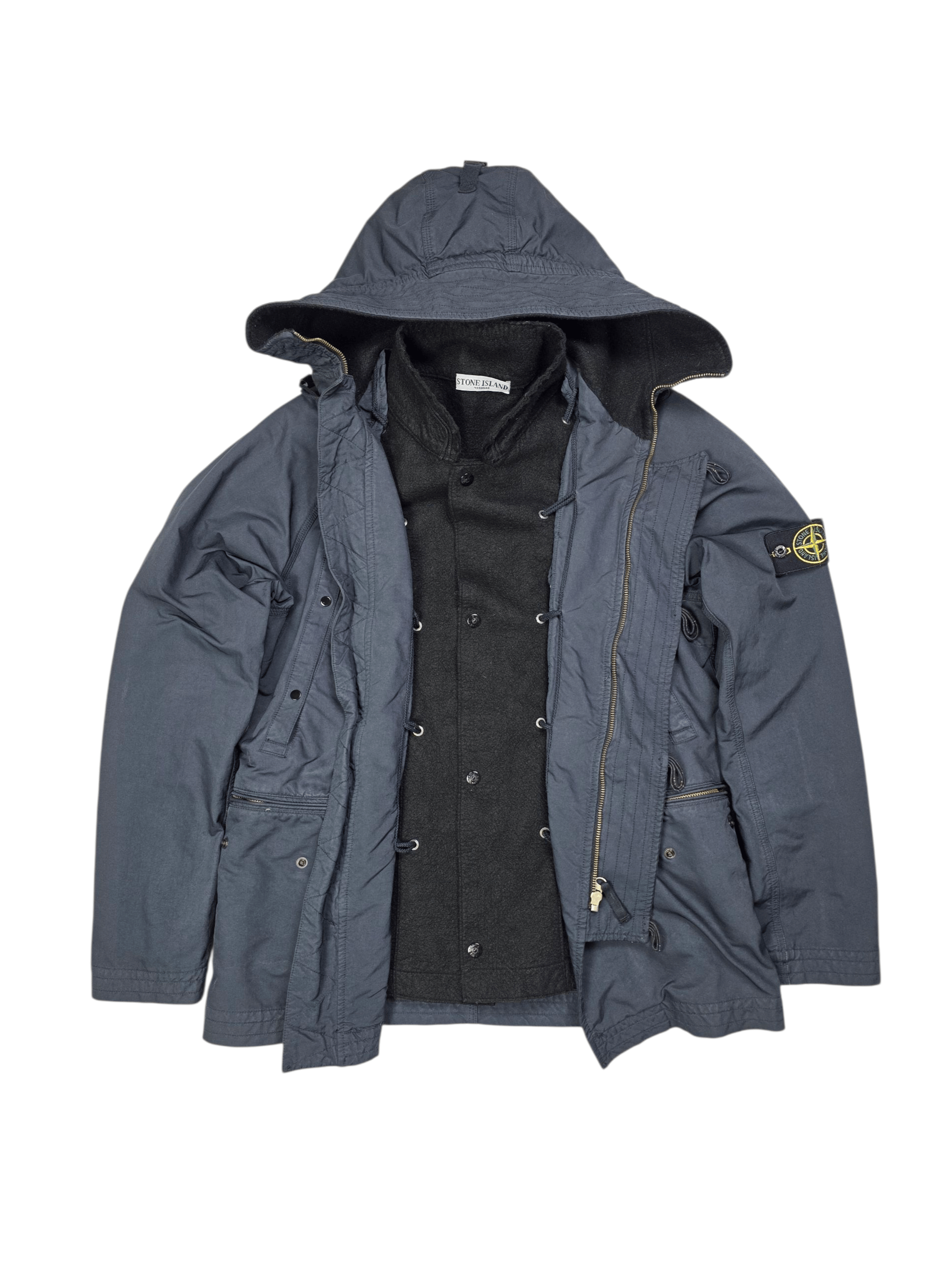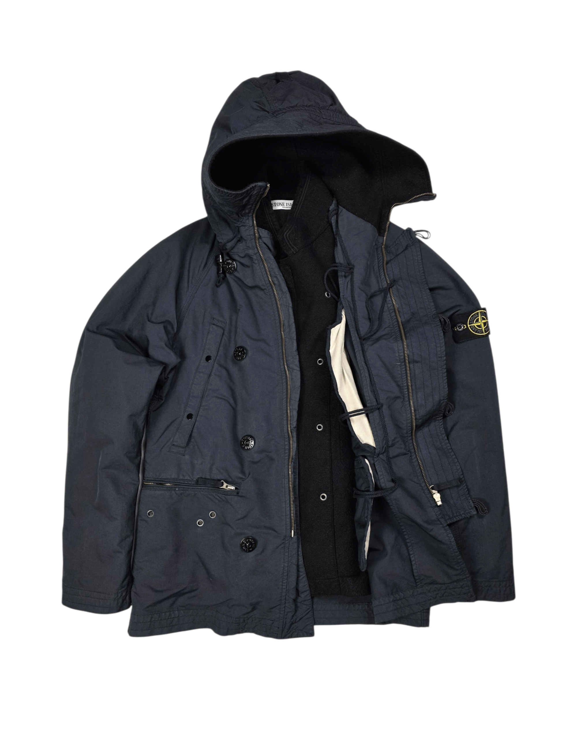 Beautiful Stone Island Dual layer parka, featuring a removable mottled wool liner, multiple functional pockets, and heavy metal zips.