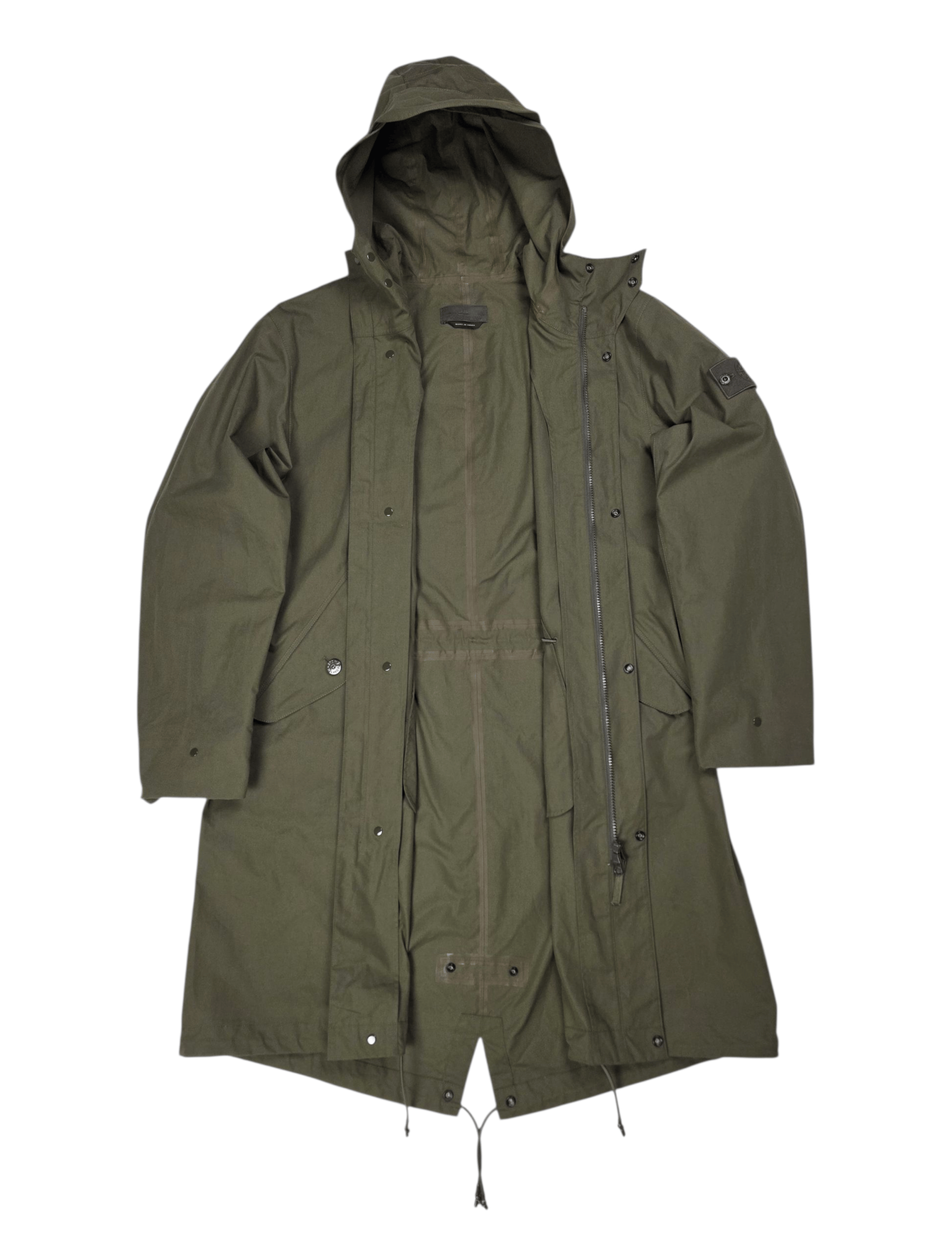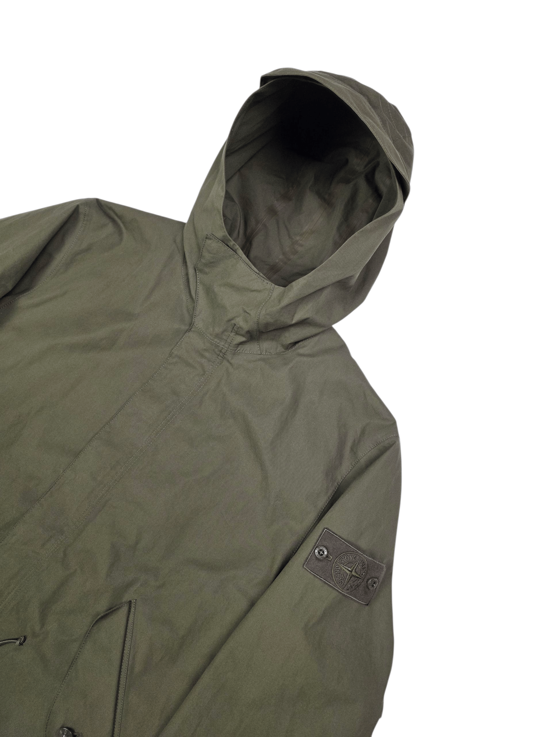 Stone Island O-Ventile Ghost Piece Fishtail Parka. Made with a zipped and buttoned front, fishtail hem, and a monochromatic Ghost badge for a streamlined look. Water repellent Ventile fabric.