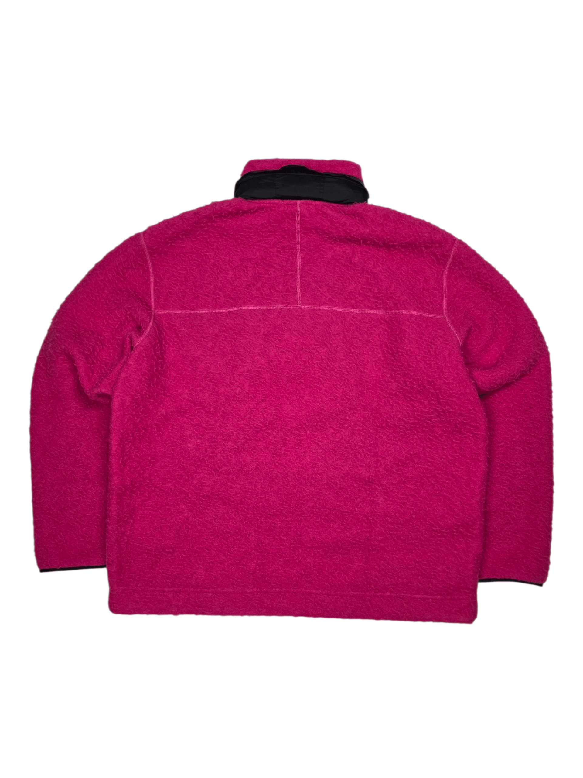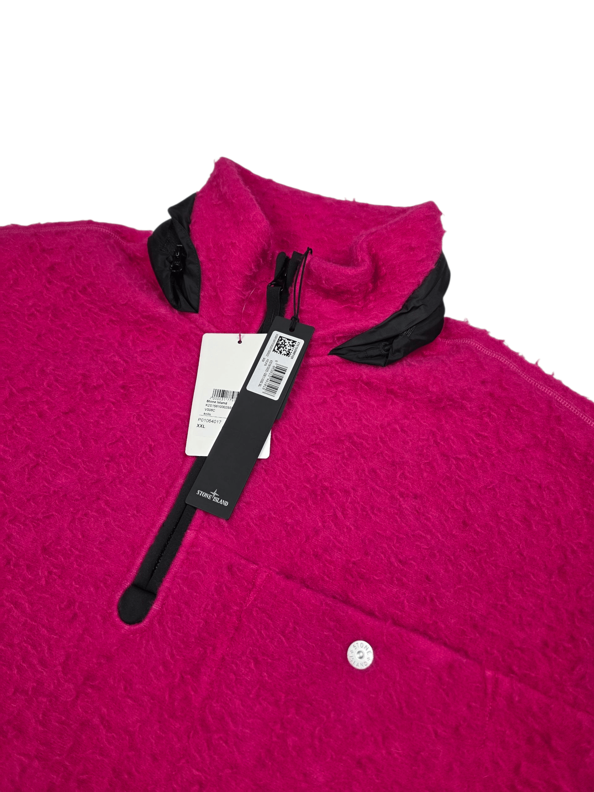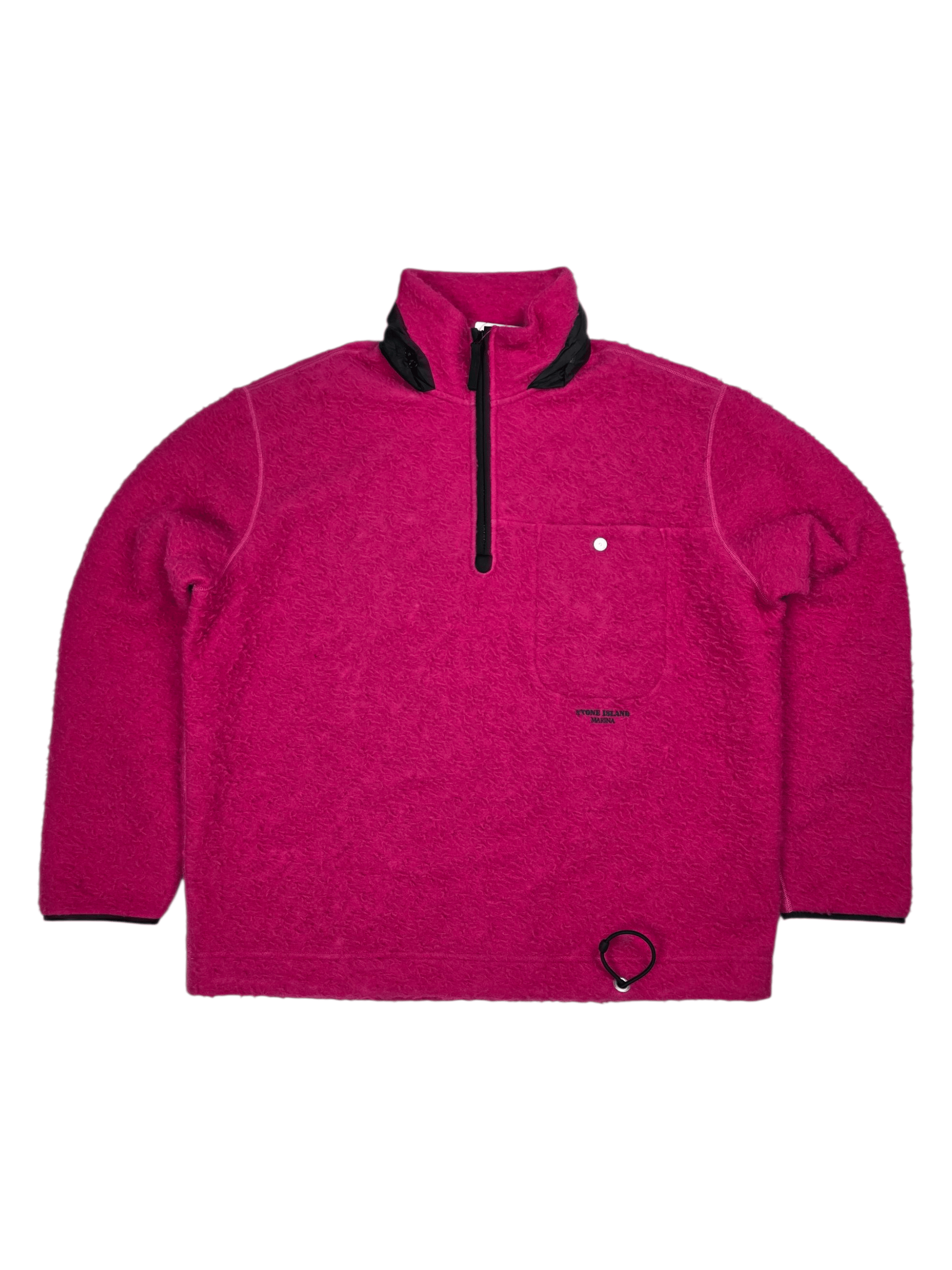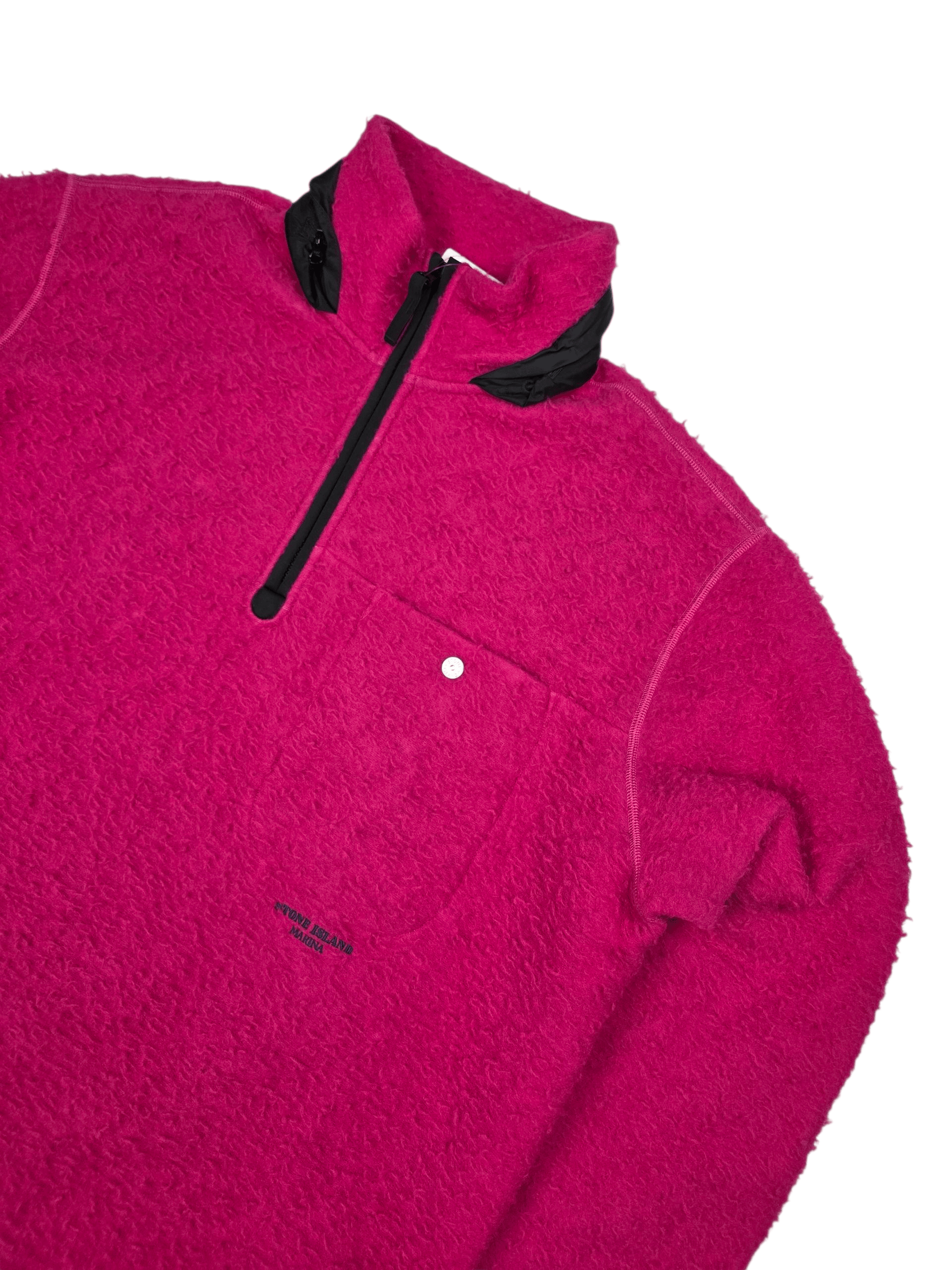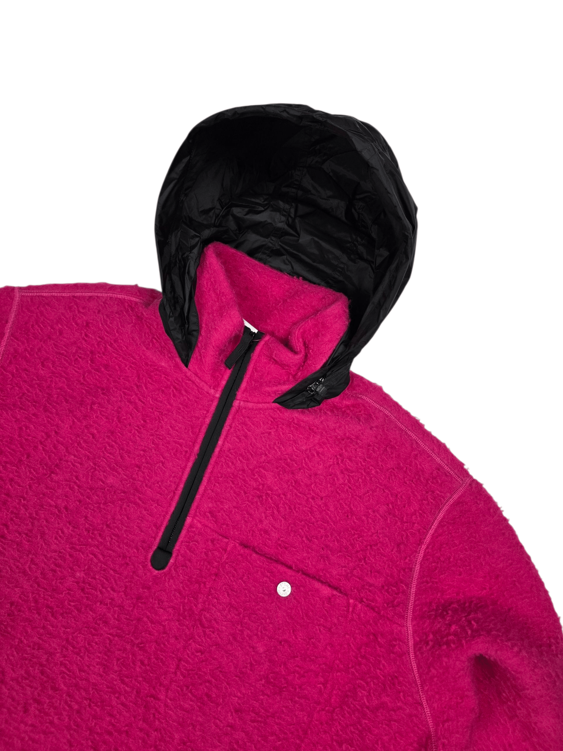 The half-zip sweatshirt is crafted from ratteen wool-polyester fleece with a mesh lining and includes a concealed hood. It features a chest pocket adorned with Marina embroidery.