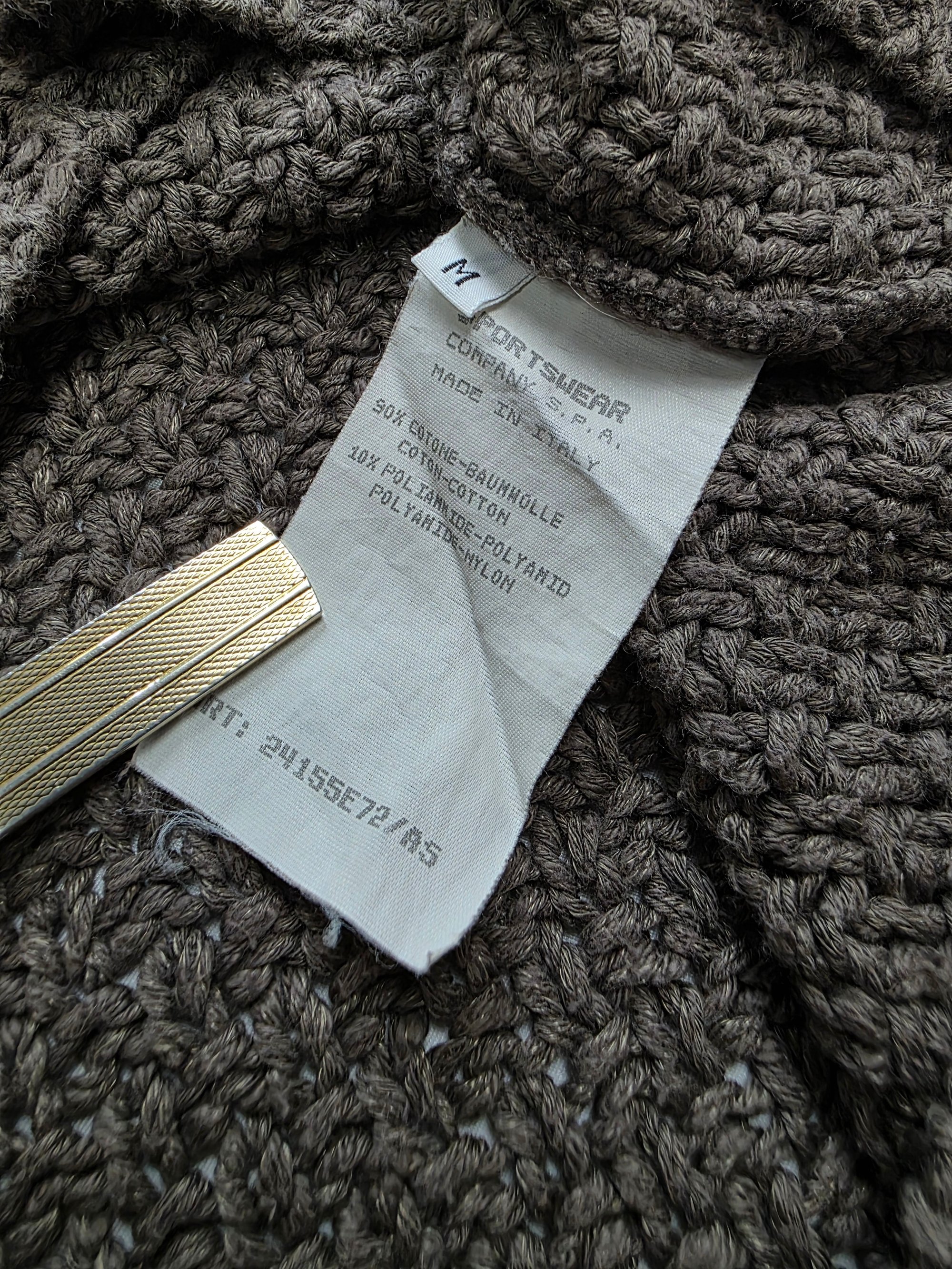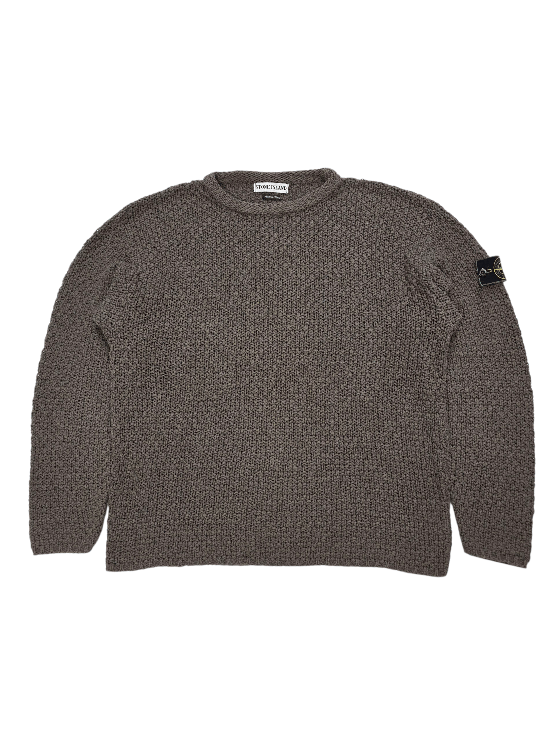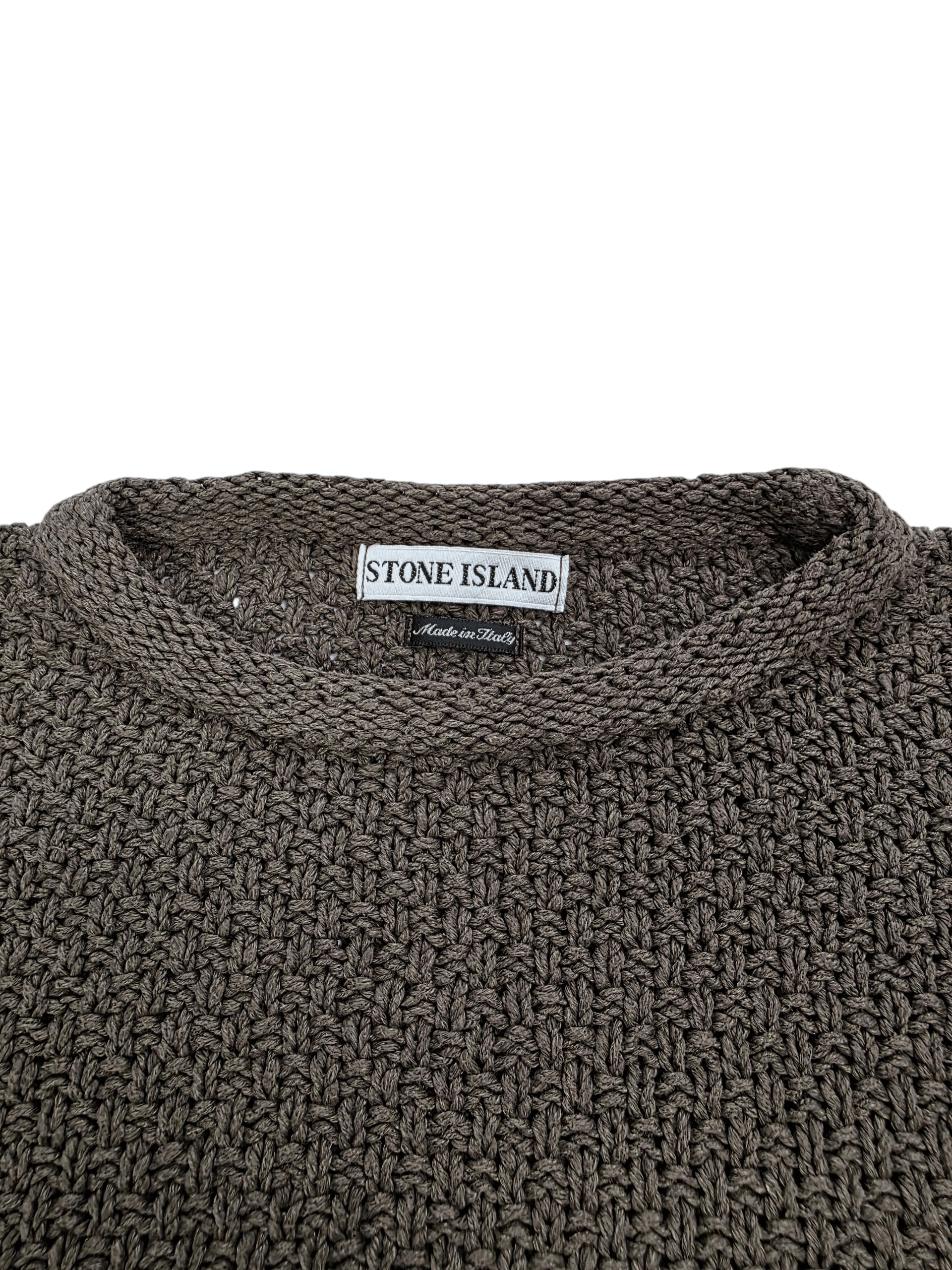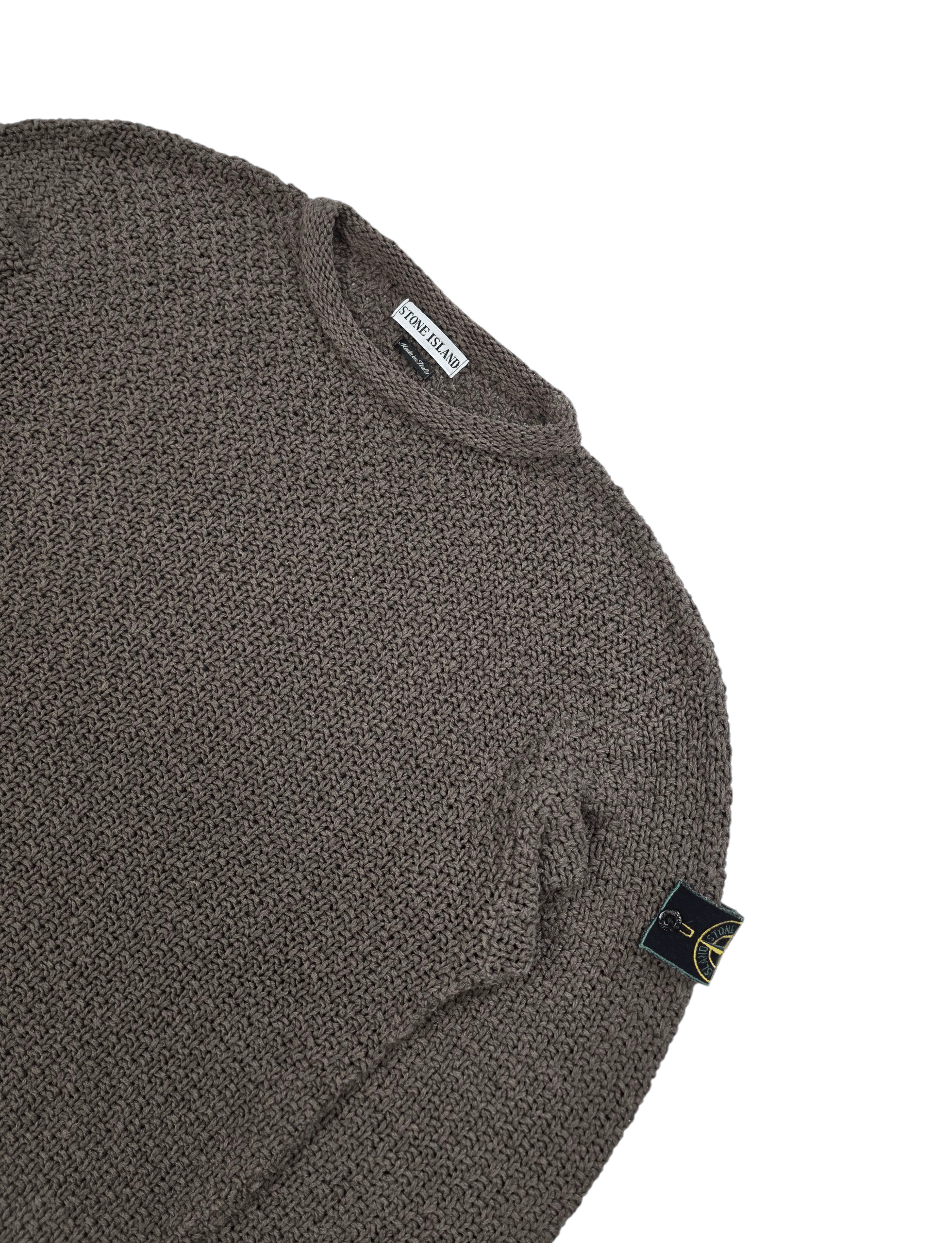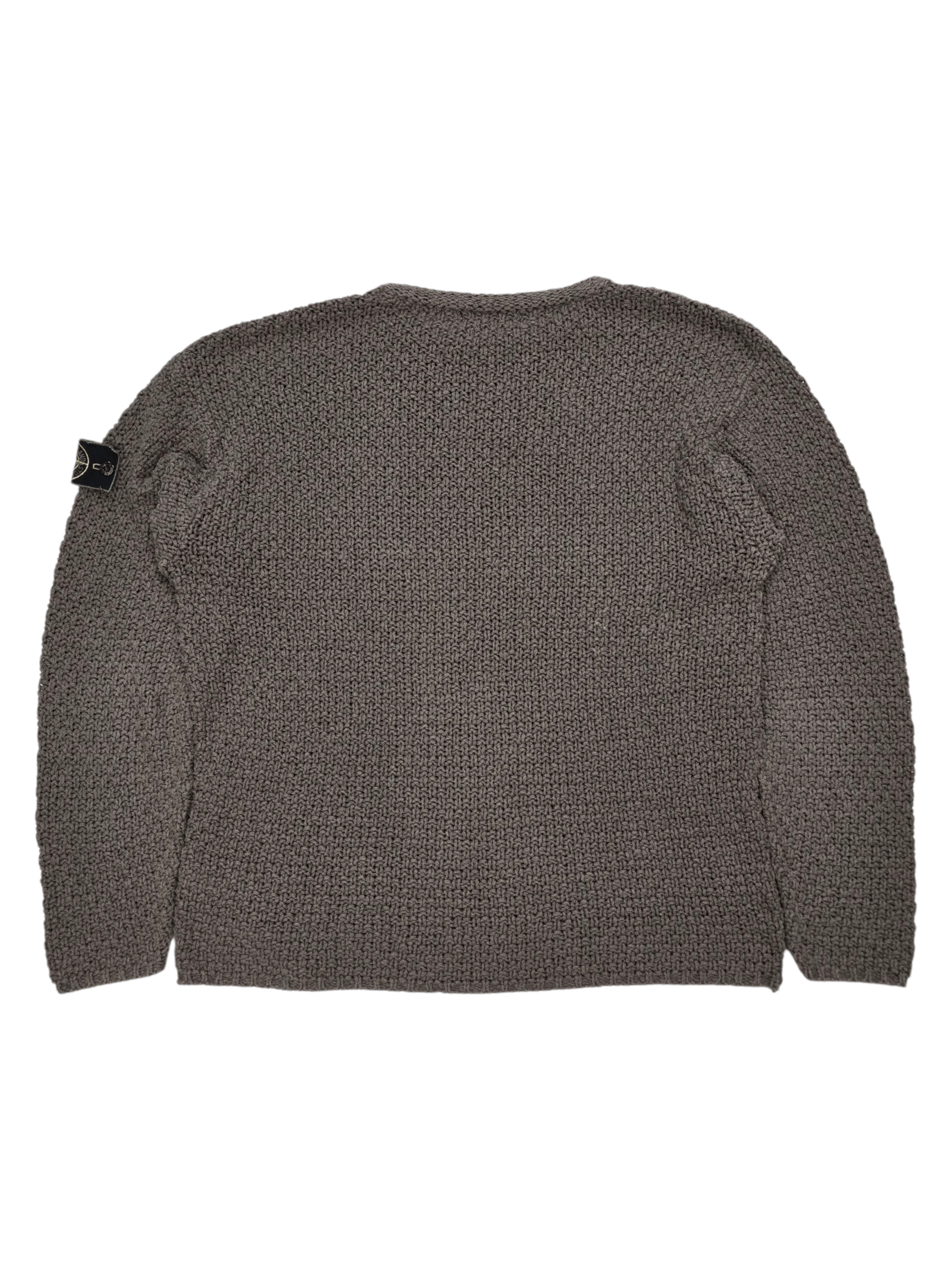 Stone Island cotton knit sweater made in Italy, featuring a thick, textured waffle style weave with a rugged hand feel. Detailed with the signature removable Compass patch at the sleeve and finished with a rolled crew neckline and straight hem.